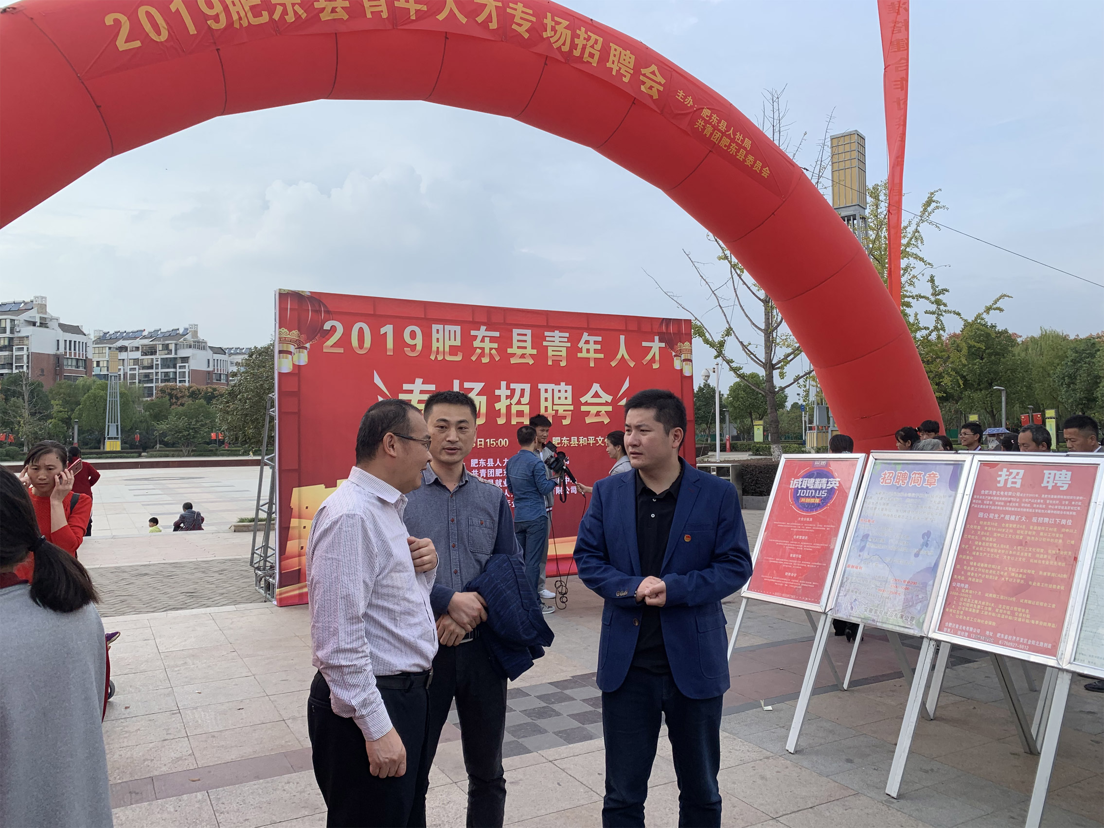15时左右,县人社局就业中心罗俊主任、许铁柱主任、团县委李万宝书记一行来到招聘会现场莅临指导。此时正值入场求职高峰,和平文化广场熙熙攘攘、人头攒动。在人才政策宣传咨询区,领导们听取人才引进情况和有关人才政策介绍,要求各级各方面发挥线上线下平台载体作用,加强用人单位与求职者供需对接,宣传推介肥东人才政策、发展环境,提供便捷高效的人才服务。